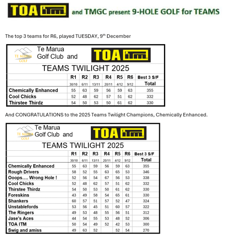 TOA ITM – Teams Twilight 2025 – FINAL Results Here are the Final Results – The top 3 teams for R6 (played Tuesday 9th Dec) and the overall 6-week tournament results Share this: Click to share on X (Opens in new window) X Click to share on Facebook (Opens in new window) Facebook Related