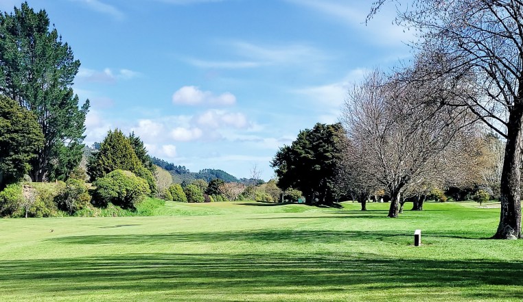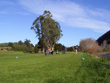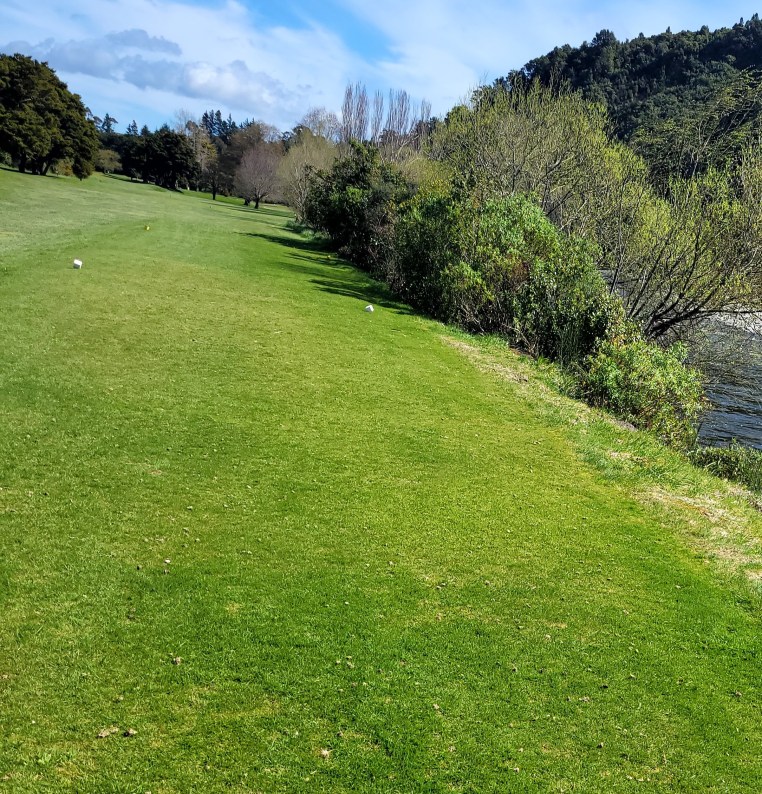 A narrow tee shute with the river on the right, totara trees on the left, but opening up into a wide playing area. The fairway takes a slight dog-leg left toward a sloping left-to-right green. Middle-right of this fairway off the tee is the place to be.